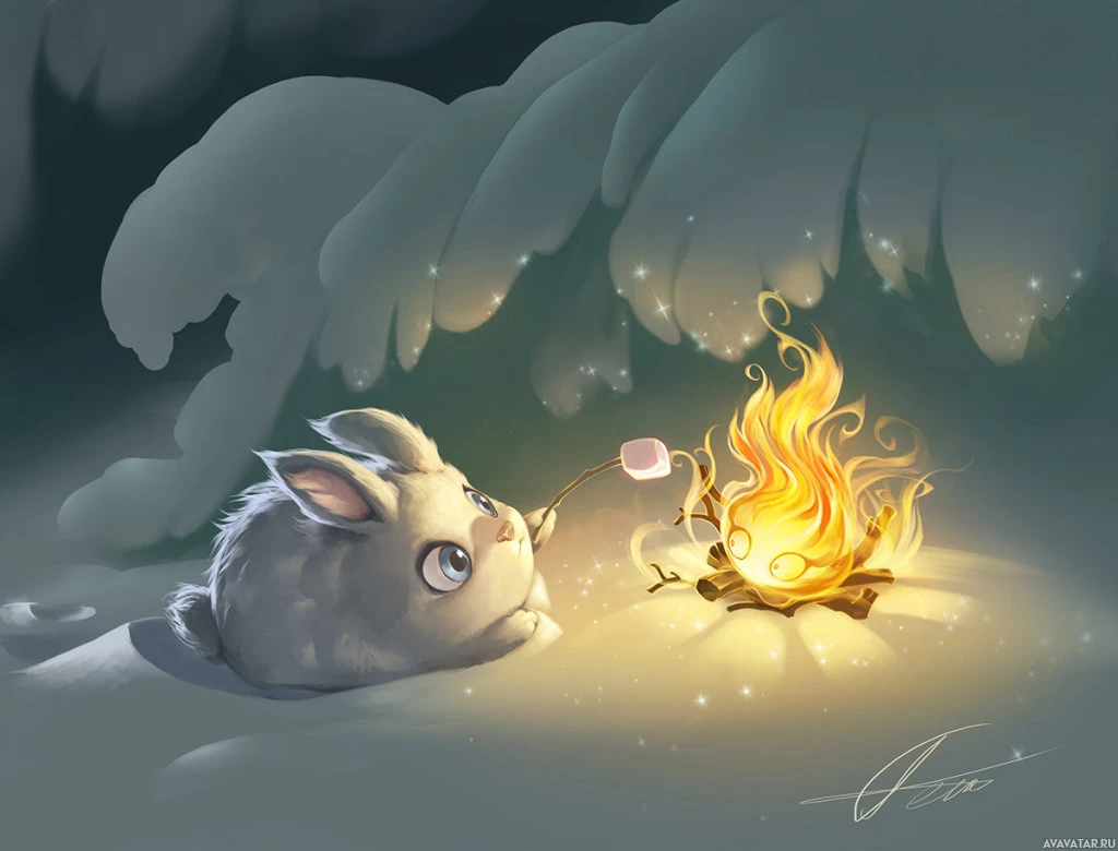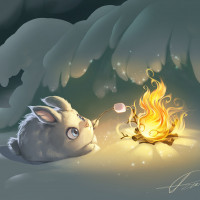 The image depicts a cartoon-style rabbit sitting by a fire. The rabbit is on the ground, looking at the fire with