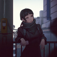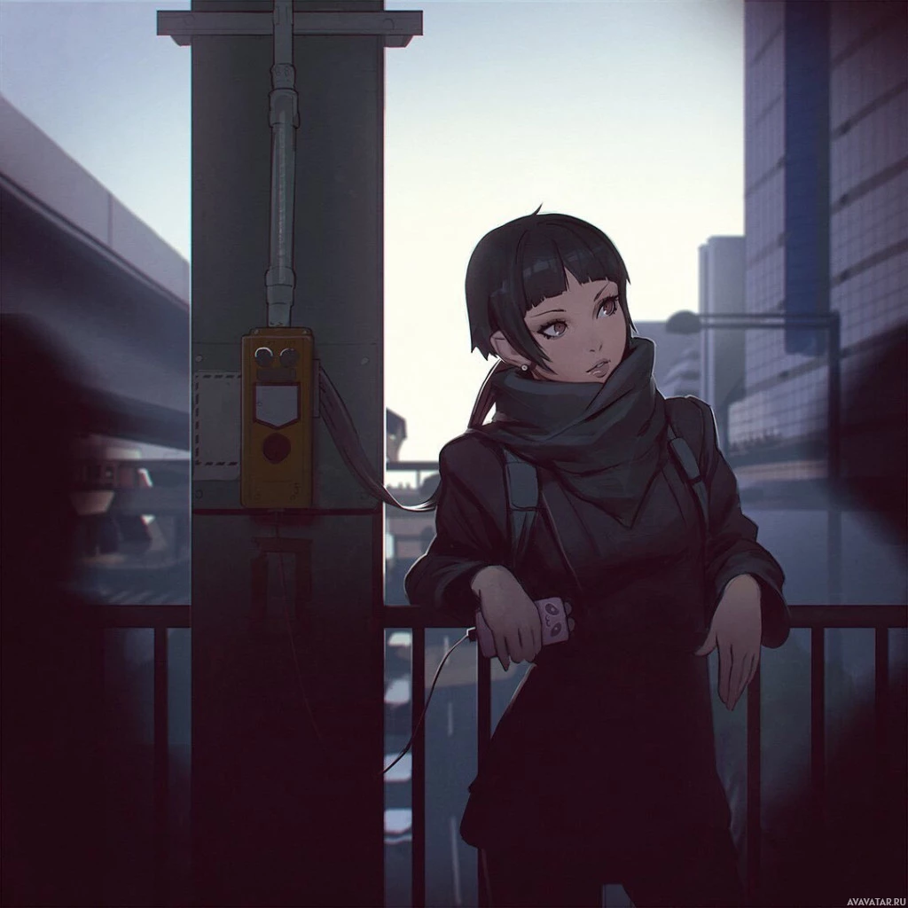 short hair and a backpack, sitting on a rail near what appears to be a subway or metro station. She has earbuds plugged into her ears and is looking off to the side. There's