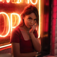 neon lights, suggesting she might be at a restaurant or similar establishment that serves food or drinks. The overall atmosphere of the photo appears to be casual and modern.
