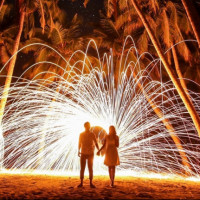 silhouetted figures standing in front of a group of tropical trees. They appear to be engaged in an activity that involves sparklers or fireworks. The lighting in the image creates a dramatic effect, emphasizing the shapes and contours of the people and trees against