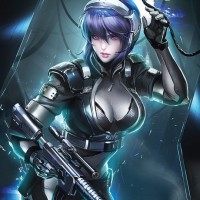 advanced technology or weaponry, and her pose suggests she is ready for action. The background has a dark and moody vibe, which fits the character's theme of being some kind of combatant or operative.