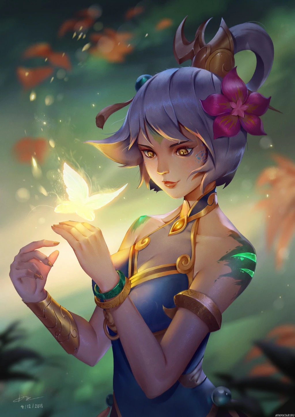 blue hair and is wearing what looks like traditional Asian attire, including a dress with gold accents and some sort of armor on her shoulders. In her hands, she holds