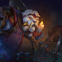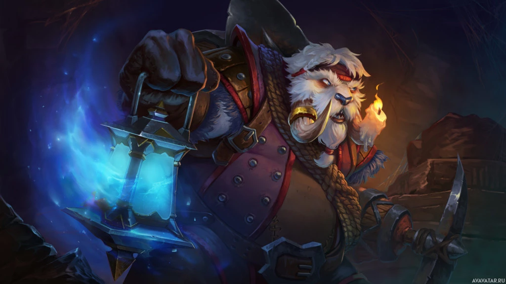 a playable hero known for his strength and agility in battle. He's holding a staff with an illuminated blue gem on top and has