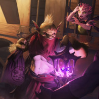 a magical artifact or weapon. The other two characters appear to be a male and female, both dressed in fantasy-style clothing, standing close by. They seem to be observing
