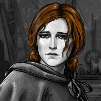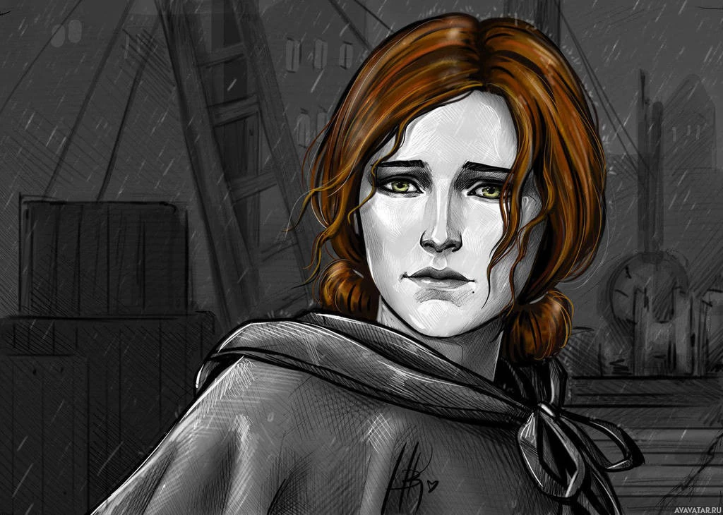 Triss Merigold from the "The Witcher" game series. She appears to be in a somber mood, as evidenced by her