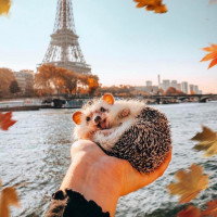 In the image, there is a person holding a hedgehog in their hands. The backdrop features
