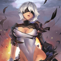 blonde hair and is holding a weapon in one hand, suggesting an action or combat theme. The background includes elements of destruction and darkness, which might indicate a battle or