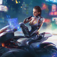 a female character, possibly from science fiction or futurism-themed media. She is riding a motorcycle that has an advanced and sleek design, suggesting a setting in the future or