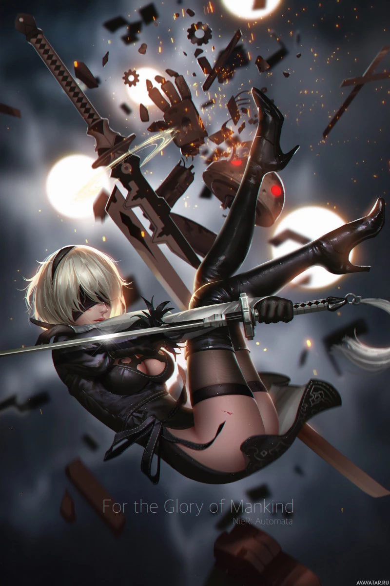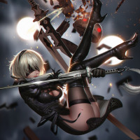 an animated character who appears to be from the game Nier: Automata. The character is depicted in mid-air, holding swords and surrounded by mechanical debris, suggesting