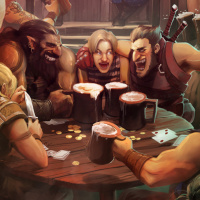 a fantasy setting. They are sitting and standing around a table in what looks like a tavern or bar, with some holding drinks such as