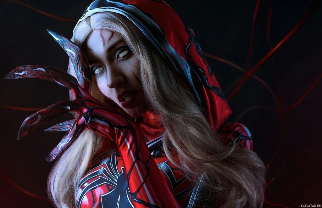 The image depicts a person wearing cosplay attire, which is inspired by the character Carnage from