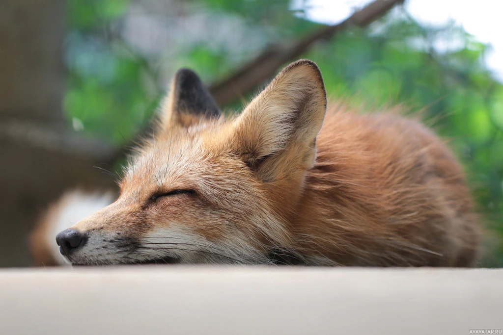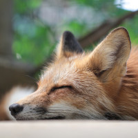 На снимке изображена красная лиса, покоящаяся головой на возвышенной поверхности, возможно, спящая. По-видимому, он находится в естественной среде, а мех лисы красновато-коричневый, что характерно для этого вида. Фокус изображения, по-видимому, заключается в том, чтобы запечатлеть спокойный момент отдыха животного.