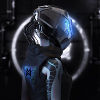 science fiction in the design of the helmet and the overall look of the character, suggesting a narrative set in a futuristic setting where technology plays a significant role. The artwork is detailed and suggests a strong focus on