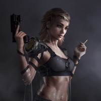 The image depicts a female character who appears to be from a video game or virtual reality experience. She is holding a pistol and wearing what looks like a tactical vest or harness, suggesting she may be playing an action role within the context of her game or environment. Her stance and expression convey a sense of readiness for combat or adventure. The background suggests a futuristic setting with fog or smoke.