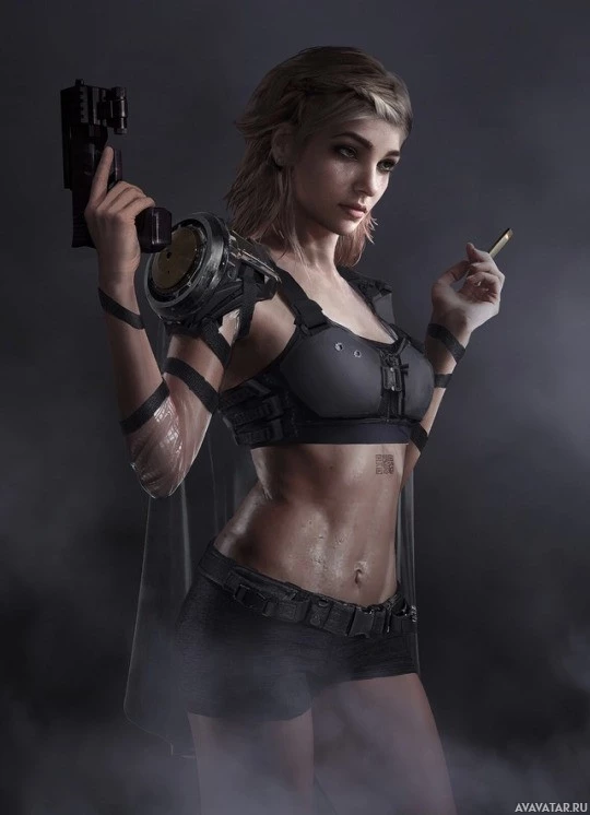На картинке изображена женщина-персонаж, которая появляется из видеоигры или виртуальной реальности. Она держит пистолет и носит то, что выглядит как тактический жилет или упряжка, предполагая, что она может играть роль действия в контексте своей игры или окружения. Ее позиция и выражение передают чувство готовности к бою или приключениям. Фон предполагает футуристическую обстановку с туманом или дымом.