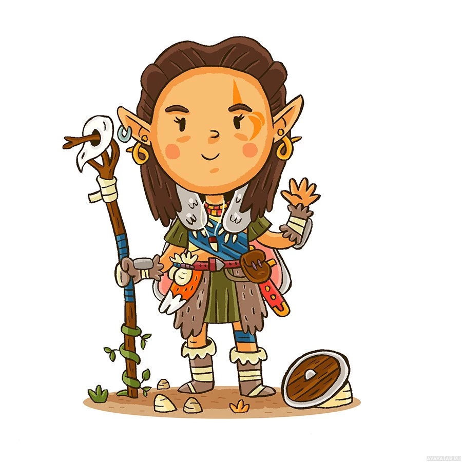 fantasy attire, including a tunic with intricate patterns, leggings, boots, and jewelry that could be interpreted as earrings or amulets. The character also holds what appears to be an enchanted staff in one hand, suggesting they may have