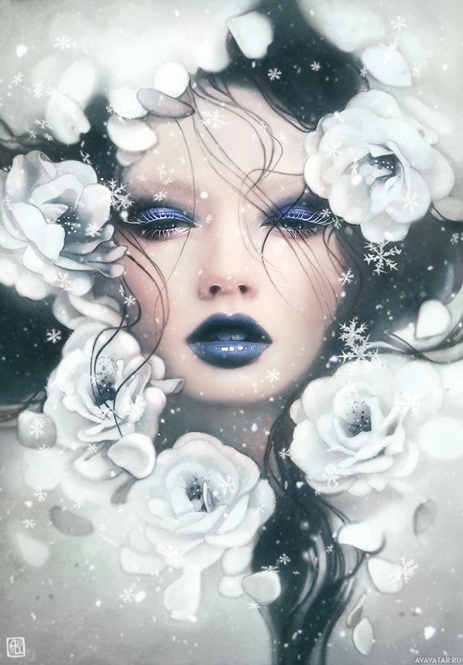 white flowers, which could be roses or another type of flower, and there's snow or ice crystals that add a wintry feel to the image. There's also a hint of sparkle or shimmer in the background, enhancing the magical quality of the artwork. The overall style is quite ethereal and might be interpreted as fantasy-inspired.
