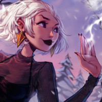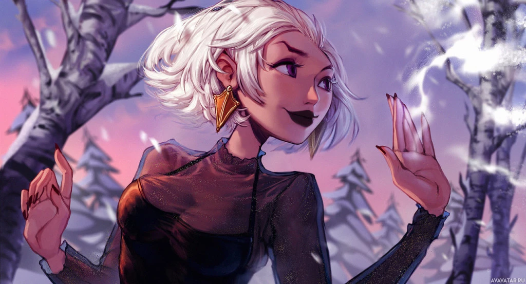 a snowy landscape during either dawn or dusk, as the sky is painted with soft hues of pink and blue, suggesting either sunrise or sunset. The character is wearing a dark outfit that could imply she's dressed for