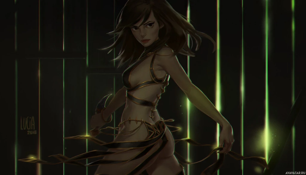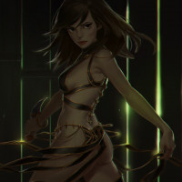 a dynamic pose that suggests movement, and she is set against a backdrop with what looks like a futuristic or cyberpunk theme, featuring green and blue light effects that give the impression of technology or energy.