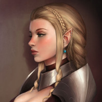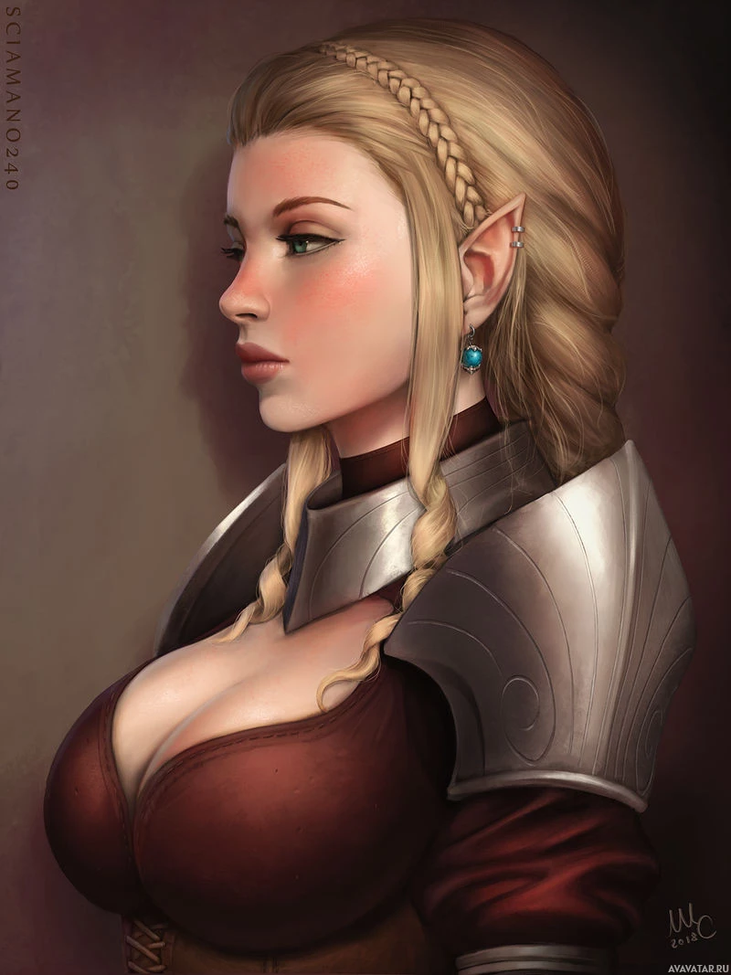 blonde hair, pointed ears typical for elves in fantasy media, and her attire consists of a breastplate and armor with a chainmail skirt, suggesting she might be a warrior or a protector of some sort. The art style is realistic, with