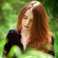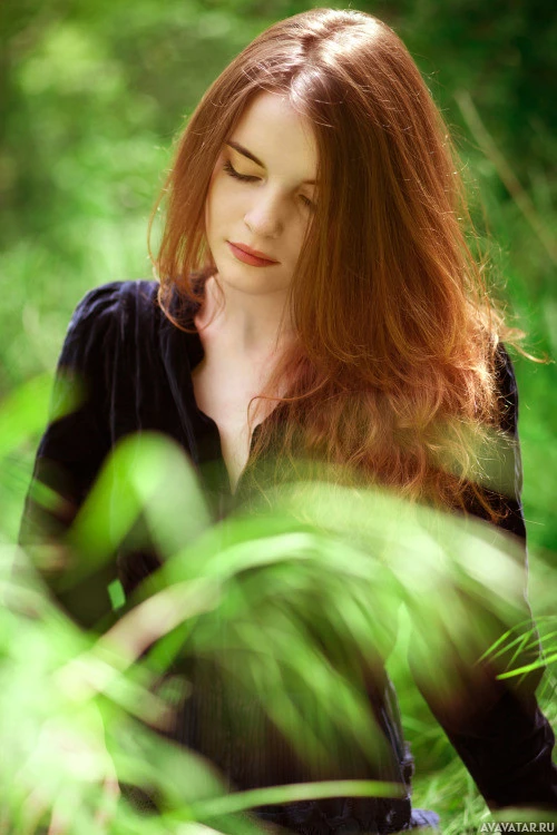 a natural setting, possibly a wooded area given the greenery around her. The overall atmosphere of the picture seems calm and introspective.