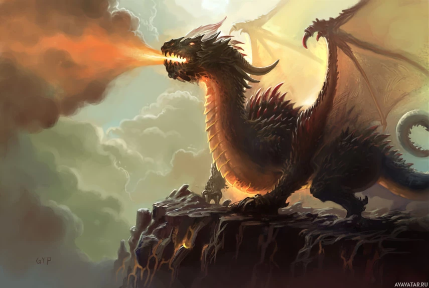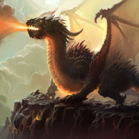 a dynamic pose, possibly roaring or breathing fire from its mouth. It stands on what appears to be the edge of a cliff or