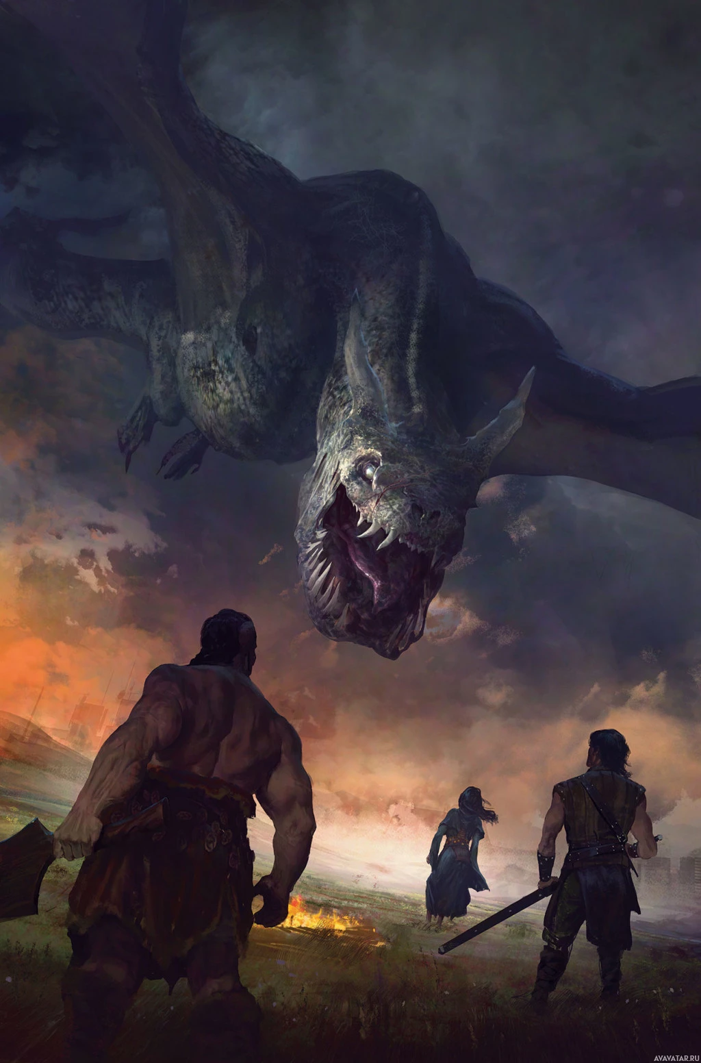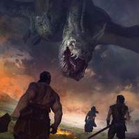 a fantasy scene featuring characters that appear to be warriors or soldiers, facing a menacing dragon. The setting seems to be outdoors with a dramatic sky, suggesting