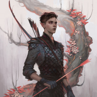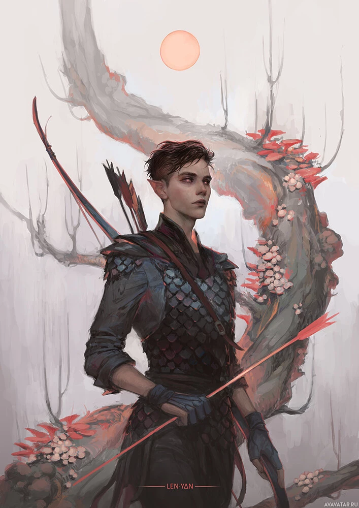 pointed ears, often associated with elves in fantasy settings. They are wearing armor and carrying a bow and arrow, which suggests they might be a warrior or hunter in their world. The background features a whimsical, otherworldly landscape with trees and a large moon that gives off
