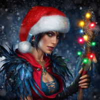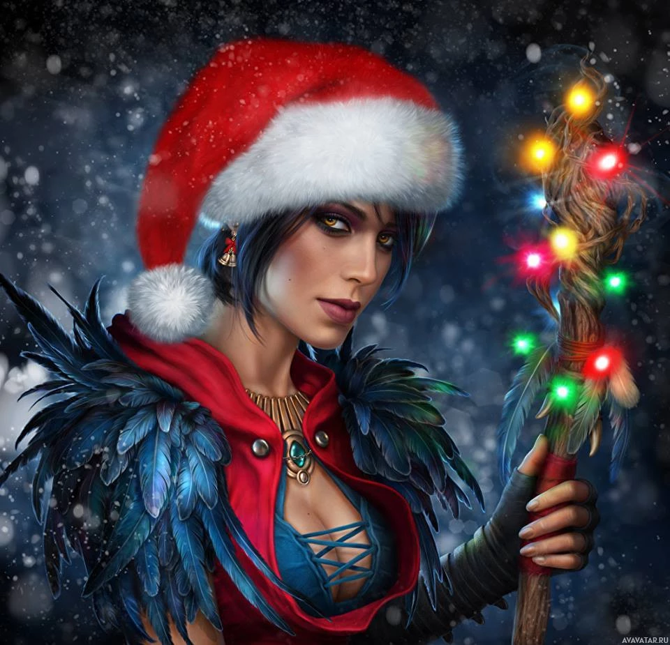 a Santa hat with a white pompom on top. She also appears to be holding a wand or staff adorned with