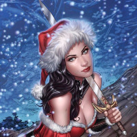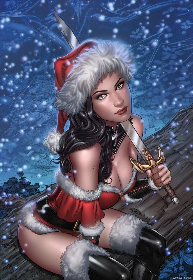 dark hair and is wearing a Santa Claus hat, which adds a festive touch to her appearance. She's also holding a sword, suggesting she might be involved in some
