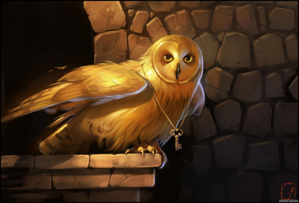 yellow feathers that shine in the light. In front of the owl, there is a key hanging from what appears to be a door or gate handle. The setting looks like it could be an indoor area, possibly part of a castle or an old building, with