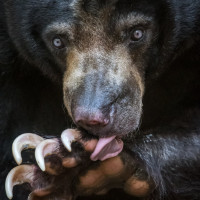 The image shows a brown bear. It appears to be licking its paw, which is a common behavior for bears to groom themselves. The bear's fur looks thick and the claws are visible on its front paws, indicating it may be a young adult or fully grown bear.