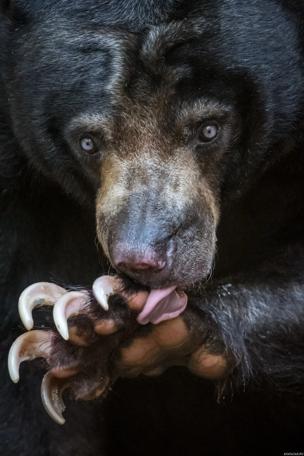 На картинке изображен бурый медведь. Похоже, что он облизывает лапу, что является обычным поведением для медведей, чтобы ухаживать за собой. Мех медведя выглядит толстым, а когти видны на передних лапах, что указывает на то, что это может быть молодой взрослый или полностью выращенный медведь.