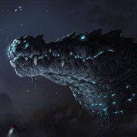 a fantastical scene featuring a large crocodile-like creature in a nighttime setting. The creature is situated on the right side of the image and appears to be looking at