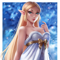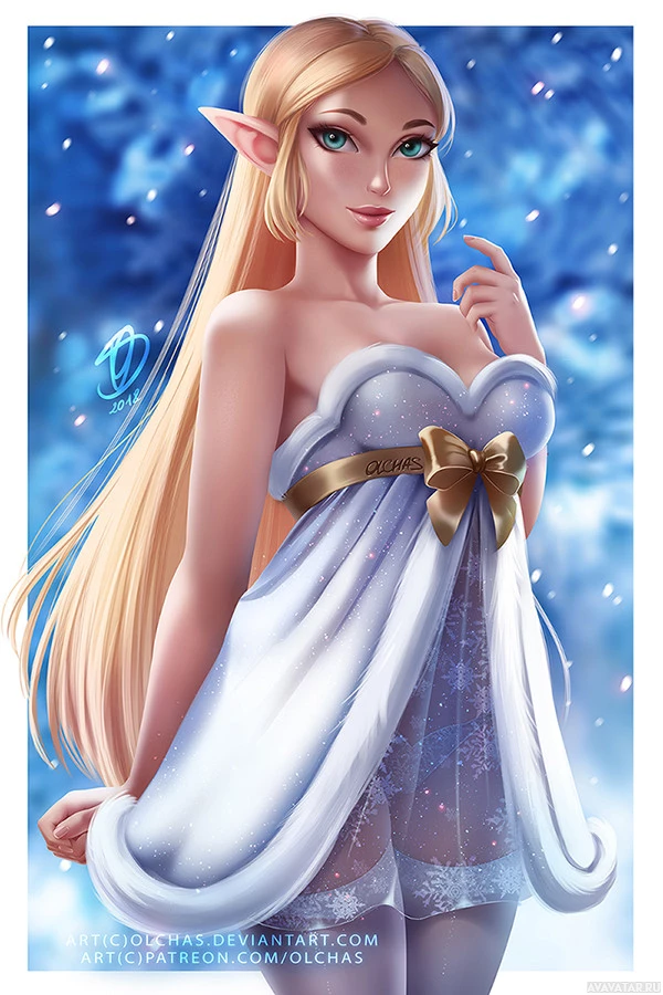 covered ground and blue trees, suggesting it might be wintertime. The elf is wearing a white gown with