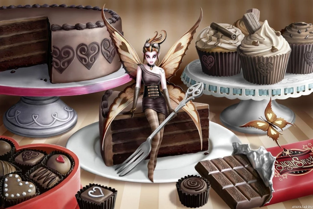 a whimsical scene featuring a fantasy-themed cake. On the cake, there's a figure that resembles a fairy or a character from