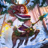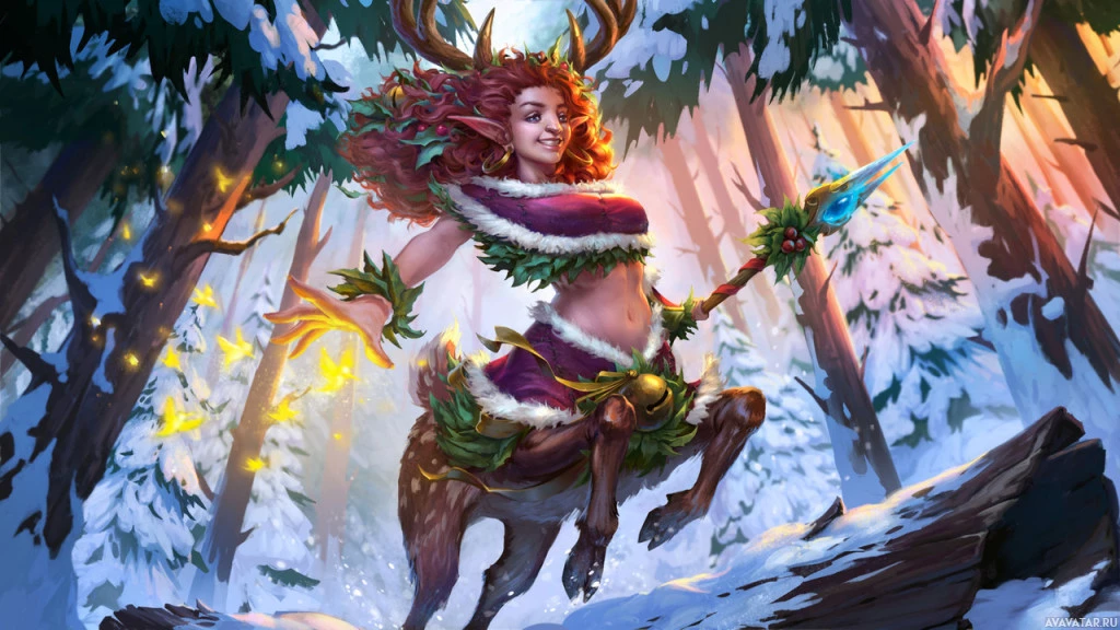 The image features a character from the game Dota 2. She is known as Enchantress, and she is depicted in a fantasy setting with magical elements, such as sparkling orbs, flames, and mist. Enchantress is shown wielding what appears to be a staff that emits light, suggesting she may have abilities related to magic or illusion within the game. The background consists of snow-