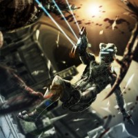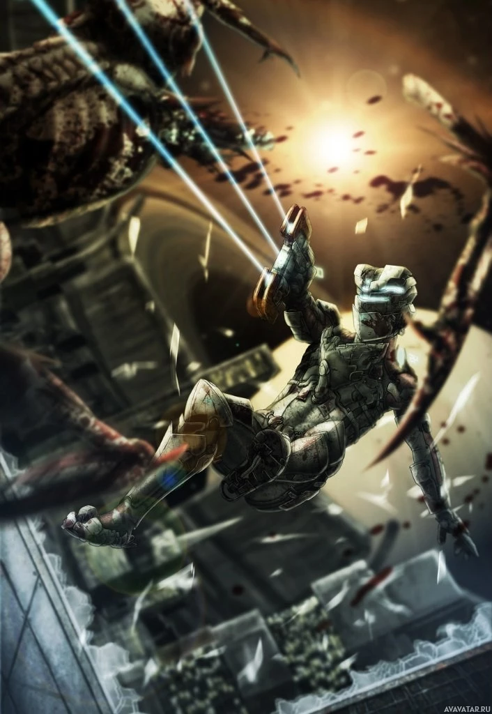 the video game "Dead Space." It depicts a character, presumably from the game, in an intense