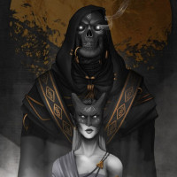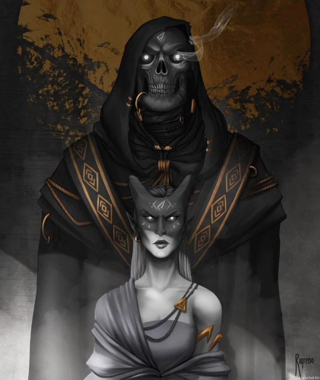 elaborate robes and also wearing a mask or helmet, which gives an impression of mystery or mysticism. To the right, a woman with