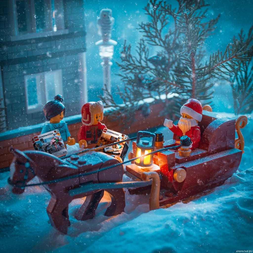 Santa Claus, complete with a red and white suit and hat, sitting in a sleigh pulled by a brown horse. Another minifigure is standing next to the sleigh, holding a present, while a third minifigure appears to be opening the present. The setting includes a snowy