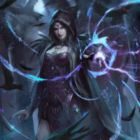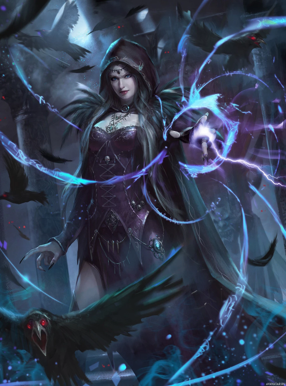 dark hair and a hood, which suggests she might be practicing magic. She's surrounded by various magical elements such as blue and purple energy swirling around her, which are indicative of witchcraft or wizardry. There are also birds, specifically ravens, that could symbolize transformation, wisdom, or death in many