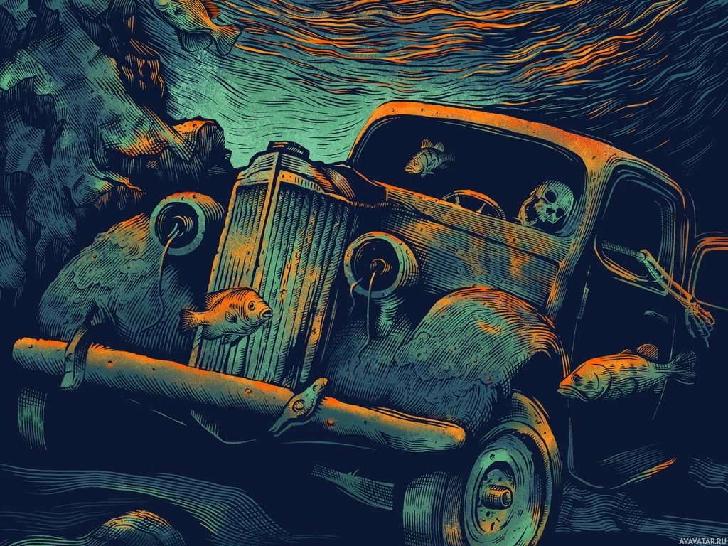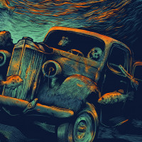 a vintage car that appears to be crashed or abandoned. There is also a skeleton visible in the vehicle, which is unusual and likely an artistic addition for