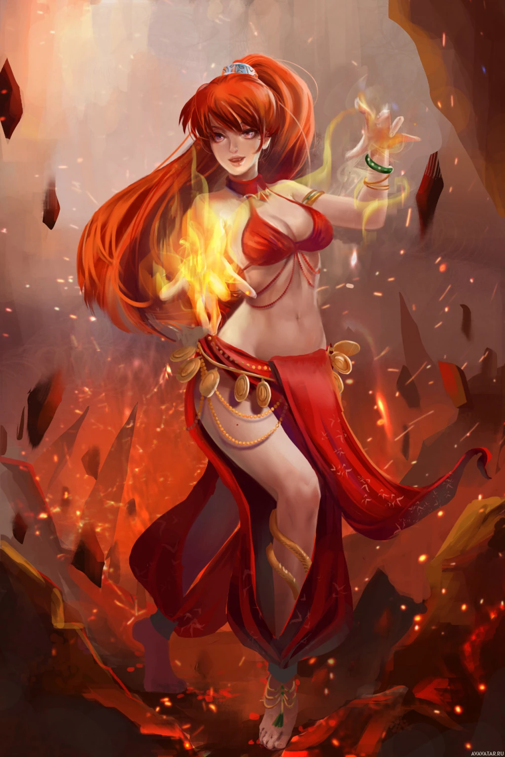 rocky terrain with lava flowing around her, suggesting a volcanic or fiery environment. Her expression seems focused or determined as she holds the flame.