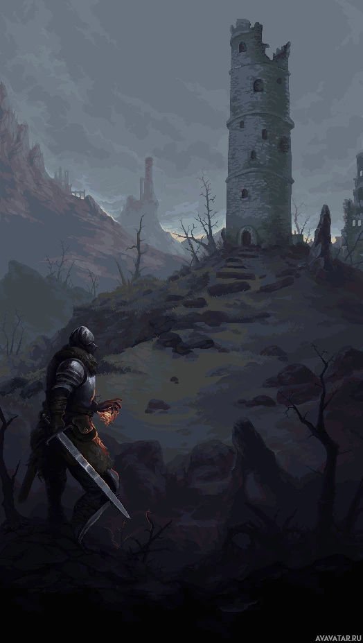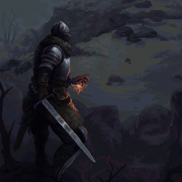 an armored warrior or knight holding a sword and standing on a rocky terrain with a castle-like structure in the distance. The sky is darkened, suggesting it could be late evening or nighttime. There are also signs of decay or