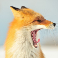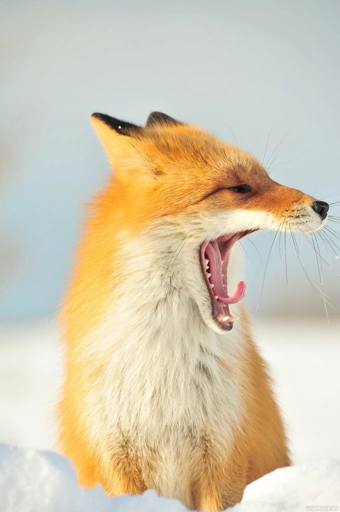 На снимке изображена красная лиса в открытой обстановке. Лиса, по-видимому, зевает, показывая свои зубы и язык, что можно интерпретировать как зевание или, возможно, даже как рычание. Фон размыт, но предполагает снежный пейзаж.