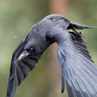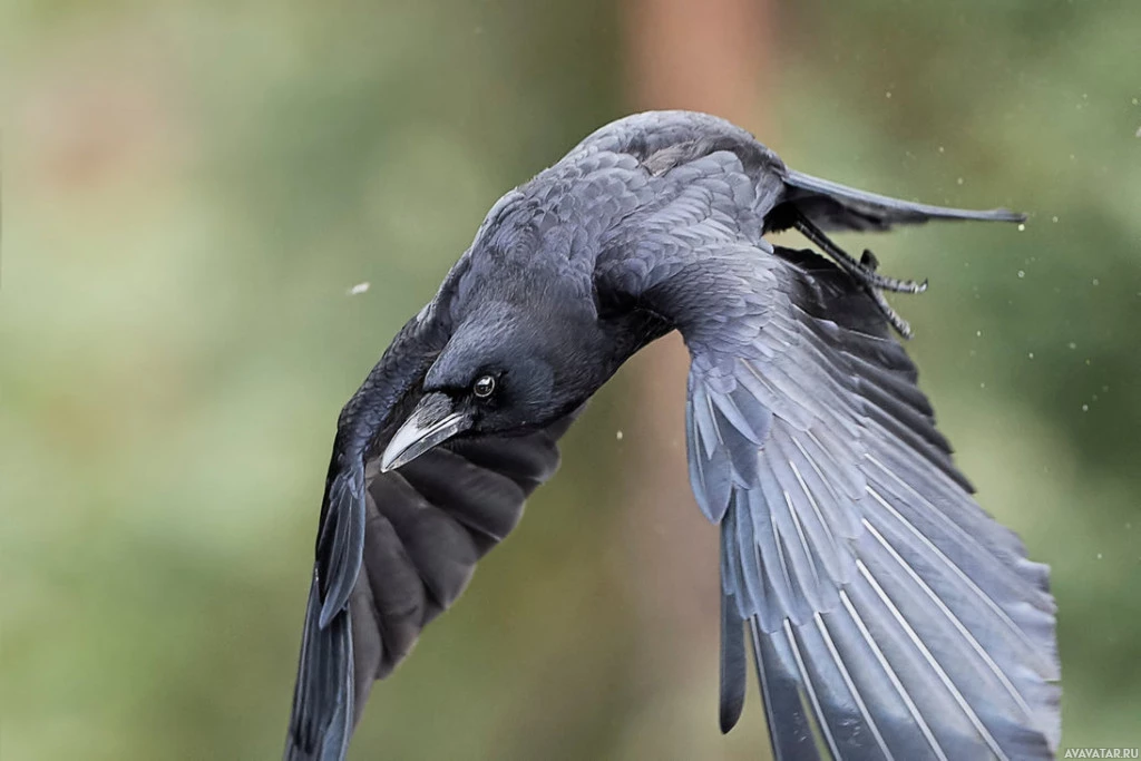 На снимке изображена птица, скорее всего ворона, в середине полета. Похоже, что он летит с широко расставленными крыльями для равновесия и движения. Фон предполагает наружную обстановку с растительностью, что может указывать на то, что фотография была сделана в естественной среде обитания или парке.
