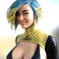a female character with striking blue hair and yellow highlights. She is wearing a black and yellow top that reads "DANGER" in