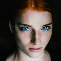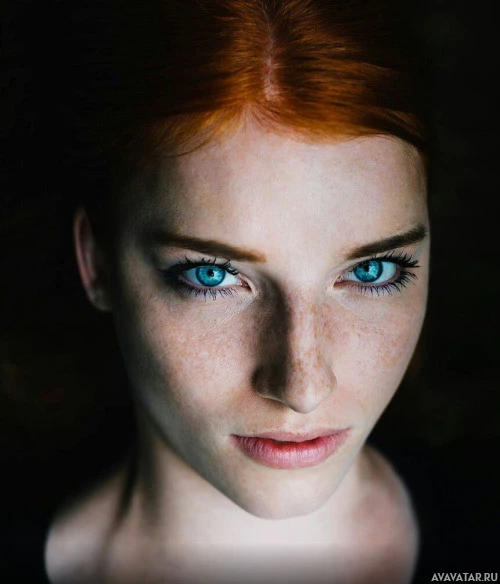 The image features a woman with red hair. She has blue eyes and is looking directly at the camera. There's a filter applied to the photo that creates an overlay of multiple images of her face, possibly to emphasize certain aspects or to create an artistic effect.