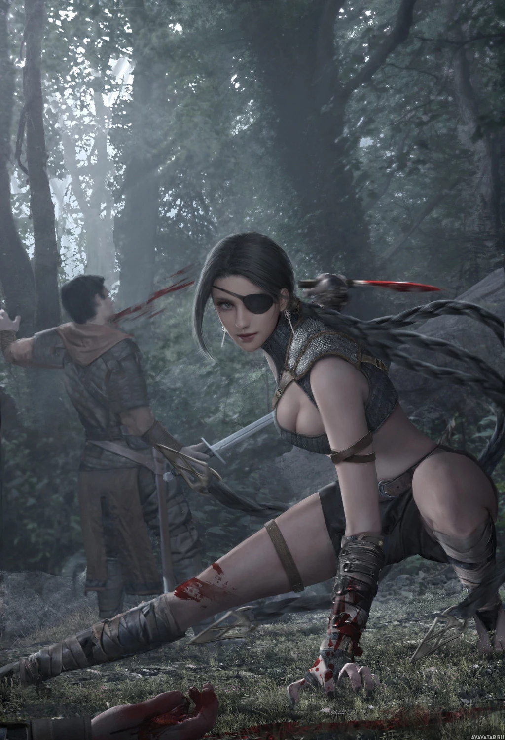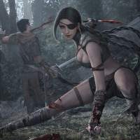 leather accents and is holding a sword. Behind her, two male characters are engaged in combat; one has his arms raised in a defensive stance, while the other has