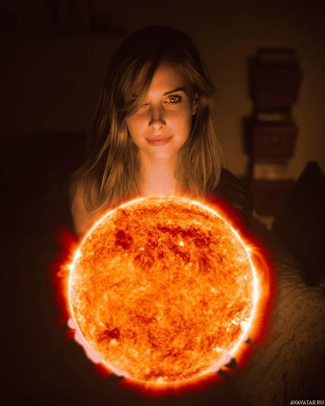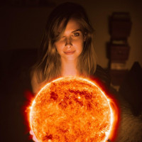 a peaceful expression, holding out her hands towards an object that resembles the sun. The sun is shown in